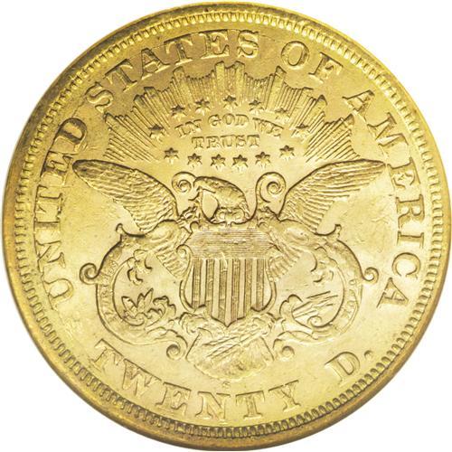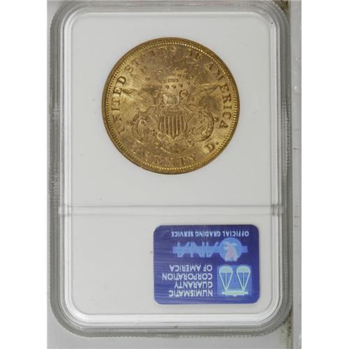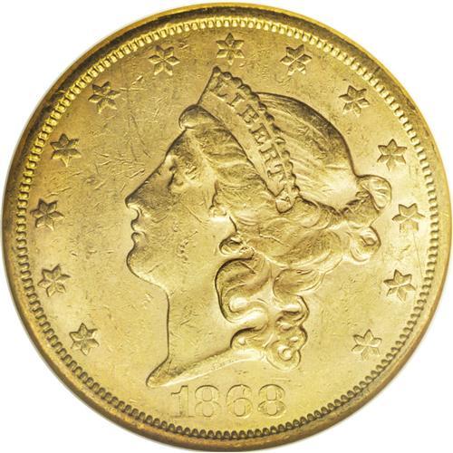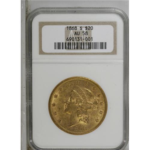 <B>1868-S $20 AU58 NGC.</B></I> David Bowers (2004) writes that: "The 1868-S is common in circulated grades. In AU it is somewhat scarce, and in Mint State the variety is exceedingly rare, more so than generally realized." The high-end AU example presented in this lot displays honey-gold patina and considerable luster retained in the recessed areas. Nice definition is apparent on the motifs, except for softness in portions of Liberty's hair. A few light abrasions are visible, particularly on the obverse.<BR><BR><b>Shipping:</b> Coin/Currency (<a target="_blank" href="http://www.heritageauctions.com/common/shipping.php">view shipping information</a>)