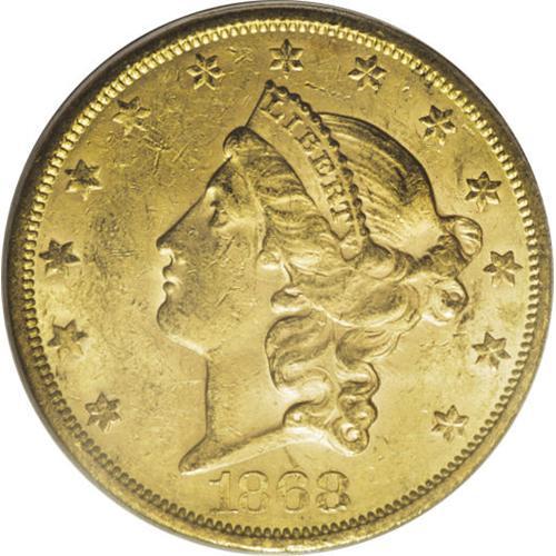 <B>1868-S $20 AU58 PCGS.</B></I> According to Jeff Garrett and Ron Guth (2006) in their discussion of the 1868 double eagle: "Very few were saved by contemporary collectors. Proof examples were the preferred method of collecting." The best that present-day collectors can hope to acquire is an AU specimen. This honey-gold AU58 coin possesses a good amount of luster, and is generally well struck, except for softness in the stars along the left border, and in portions of Liberty's hair. None of the light marks scattered about is worthy of individual mention. Population: 29 in 58, 11 finer (4/07).<BR><BR><b>Shipping:</b> Coins & Currency (<a target="_blank" href="http://www.heritageauctions.com/common/shipping.php">view shipping information</a>)