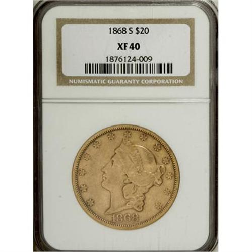 <B>1868-S $20 XF40 NGC.</B></I> NGC Census: (62/1000). PCGS Population (64/321). Mintage: 837,500. Numismedia Wsl. Price for NGC/PCGS coin in XF40: $680. (#8954)<BR><BR><B>Coin Engraver:</B> James B. Longacre<BR><BR><b>Shipping:</b> Coins & Currency (<a target="_blank" href="http://www.heritageauctions.com/common/shipping.php">view shipping information</a>\)