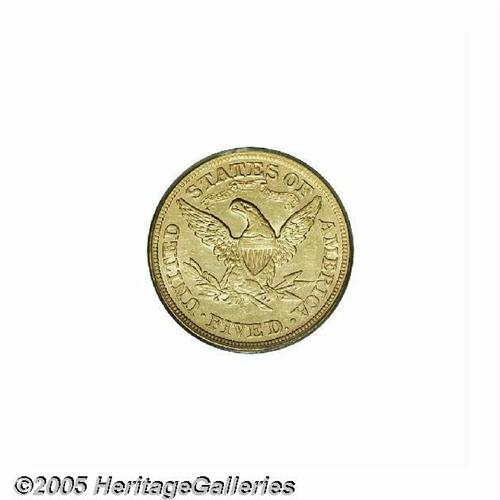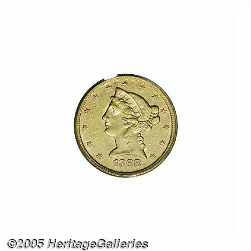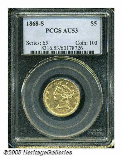 <B>1868-S<$5> AU53 PCGS.</B></I> Sharply struck and nearly fully lustrous with light yellow-gold coloration. Both sides exhibit very light surface marks as expected for the grade. Walter Breen suggested that this issue is an important rarity in grades better than extremely fine, and the PCGS population data supports his viewpoint. It seems that nearly all of the 52,000 coined entered circulation, or they were exported for trade purposes. Population: 2 in 53, 8 finer (5/05).