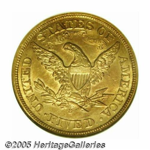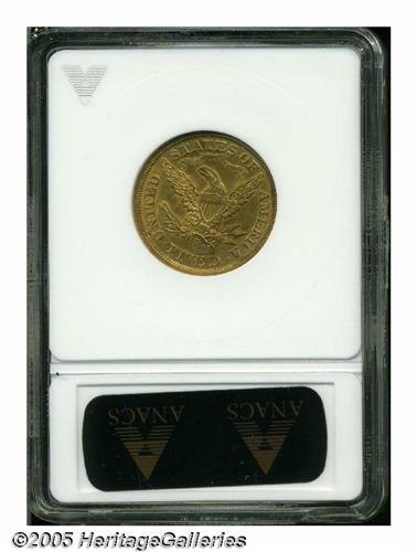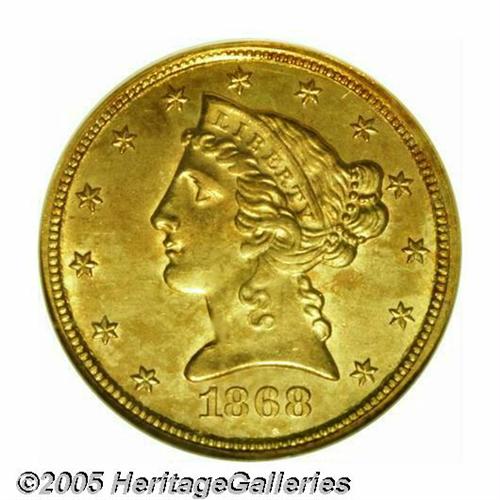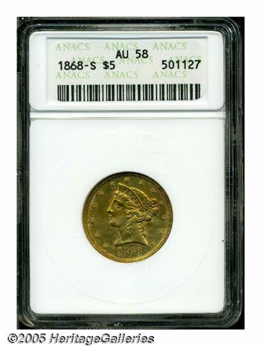 <B>1868-S<$5> AU58 ANACS.</B></I> The majority of extant 1868-S Half Eagles survive in XF to low-end AU condition, with those grading finer being just as difficult to locate as the S-mint issues from 1858-1867. The near-Mint representative offered here is among the finest known survivors of this early With Motto S-mint. Both sides show rich sunset-red patina that is somewhat mottled over the obverse. The strike is uncommonly bold and there are no discernible abrasions, just a few wispy hairlines to the left of the portrait. A magnificent coin from an aesthetic viewpoint, this specimen also possesses unquestionable rarity that deserves a carefully considered bid.