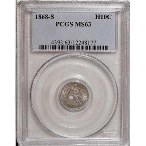 <B>1868-S H10C MS63 PCGS.</B></I> . PCGS Population (13/26). NGC Census: (23/46). Mintage: 280,000. Numismedia Wsl. Price for NGC/PCGS coin in MS63: $500. (#4393)<BR><I>From The Al Blythe Collection of Half Dimes.</B></I><BR><BR><B>Coin Engraver:</B> Christian Gobrecht<BR><BR><b>Shipping:</b> Coins & Currency (<a target="_blank" href="http://www.heritageauctions.com/common/shipping.php">view shipping information</a>)
