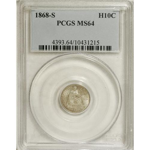<B>1868-S H10C MS64 PCGS.</B></I> Scintillating luster sweeps this precisely struck ice-blue and honey-gold near-Gem. There are no grade-limiting marks, and the eye appeal is exceptional for this low mintage issue. Population: 15 in 64, 10 finer (2/07).<BR><BR><b>Shipping:</b> Coins & Currency (<a target="_blank" href="http://www.heritageauctions.com/common/shipping.php">view shipping information</a>)