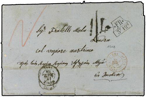 1868 Stampless envelope written from the island of Milos addressed to the Austrian Maritime Agency London, routed via Syros with boxed ANGLO-FRENCH accountancy FR/3f 12c (Van der Linden 1277) with handstamp TAX 1/4, routed via France with French entry cachet and LONDON arrival on reverse. Very fine item paying the double letter rate.