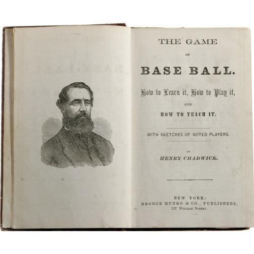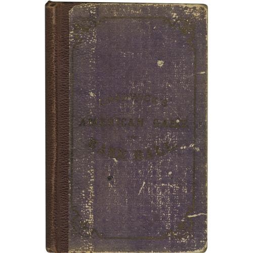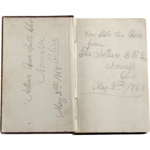 <B>1868 "The Game of Base Ball" by Henry Chadwick.</B></I> Entitled in full, "The Game of Base Ball, How to Learn It, How to Play It and How to Teach It, with Sketches of Noted Players," this tremendously scarce volume is considered to be one of the most important histories of our National Pastime, and certainly one of the earliest. The author Henry Chadwick, one of the era's most prominent sportswriters, is universally recognized as one of the foremost pioneers of the sport, and this book could be credited with encouraging the spread of the game to which Chadwick dedicated so much. The contents of the book are quite well characterized by the lengthy title, and the 178 pages of text present the most comprehensive insight into the first evolutionary steps of the game available. Despite evident surface wear to the hardcover exterior, which provides embossed golden lettering reading "Chadwick's American Game of Base Ball," the book separates itself from the small available population with a tight binding and an absence of staining or tearing to the interior pages. The interior cover and two of the opening pages feature handwritten (pencil) identifying text from the original owner with the comical notation, "You Stole this Book from The Active B.B.C., Norwalk, Ohio, May 2nd, 1868." Found in only the finest of private baseball libraries, this book is estimated to be one of just twenty that has survived to this day. One must assume that this example ranks among the finest of that thin supply.<BR><BR><b>Shipping:</b> Flat Material, Small (<a target="_blank" href="http://www.heritageauctions.com/common/shipping.php">view shipping information</a>)