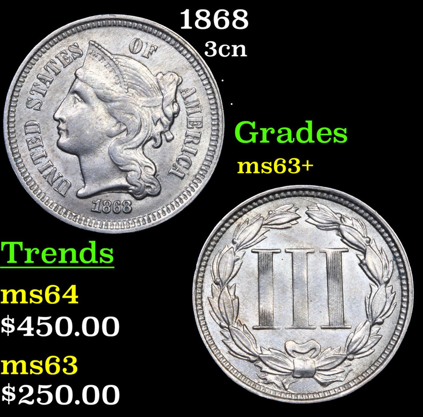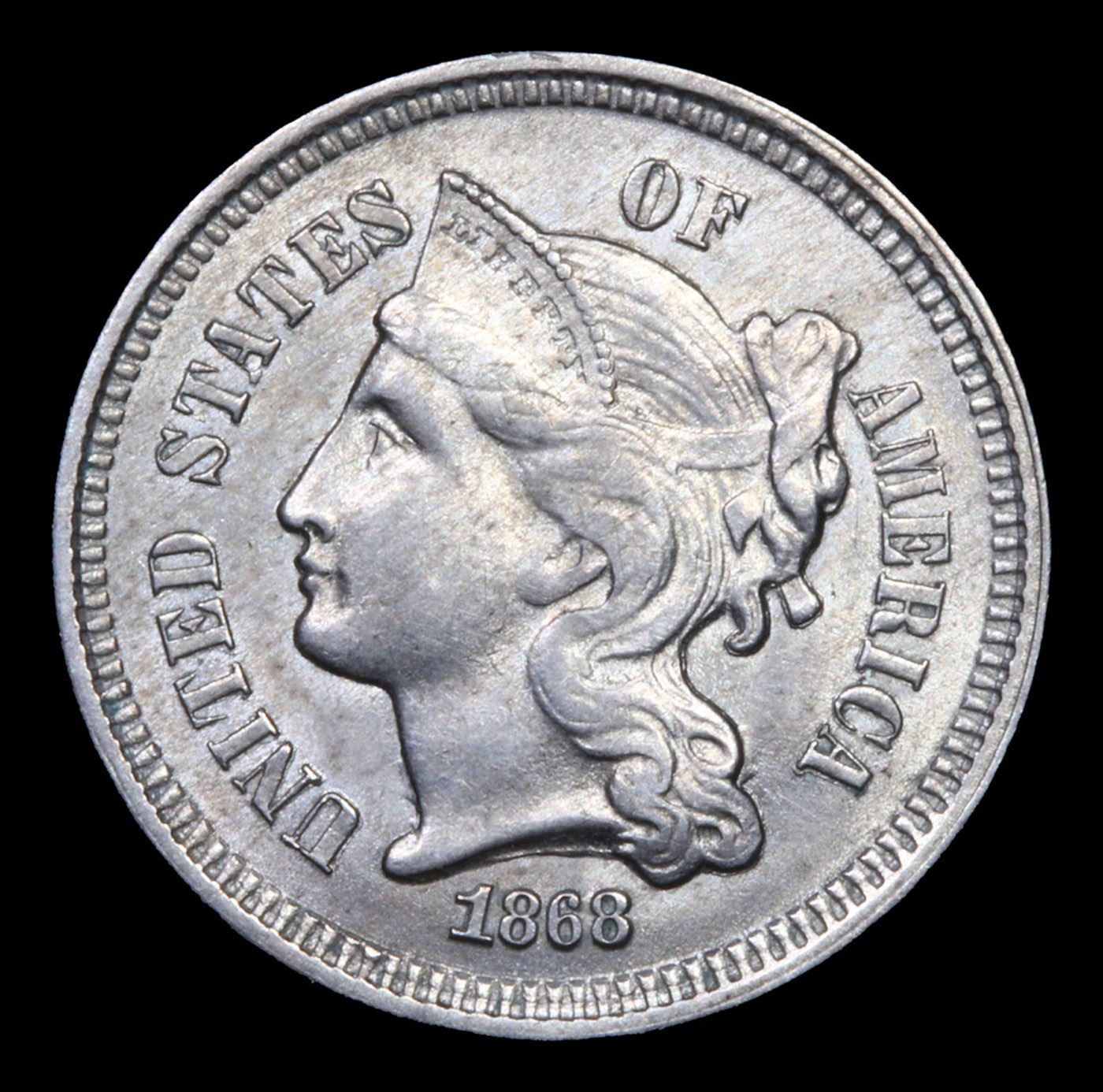 1868 Three Cent Copper Nickel 3cn Grades Select+ Unc.