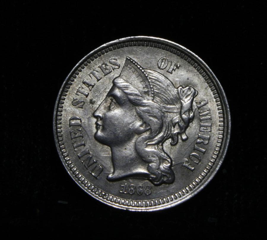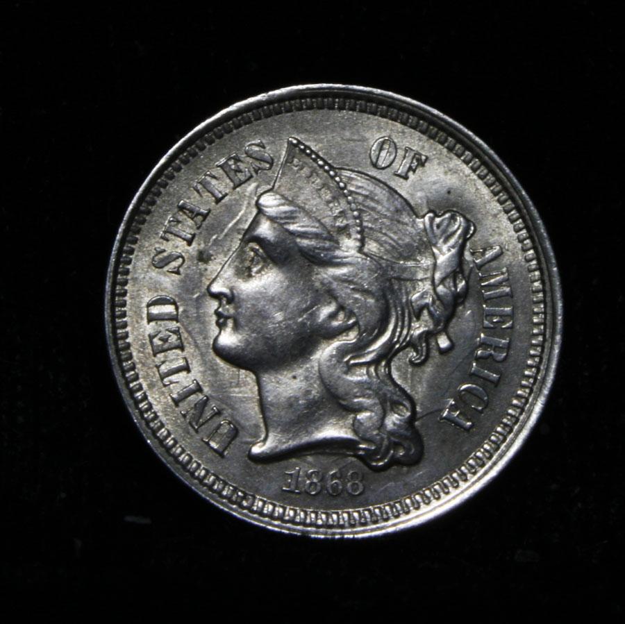 Lustrous example with the usually weak strike on the Roman Numeral on the Reverse. PCGS notes this weakness on both the 1867 and 1868 issue. Coin World's Coin Values lists ms64 at $265 and The Wholesale Greysheet lists ms64 at $190. Estimated Value $225