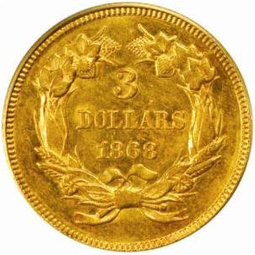 <style type="text/css"> body, td, th { font-family: Arial, Helvetica, sans-serif; font-size: 12px; color: #482424; margin: 0px; padding: 0px; } #header { background-image: url(http://www.bowersandmerena.com/ebay/images/template_v3_01.gif); clear: both; background-color: #590303; border-top-width: 2px; border-top-style: solid; border-top-color: #B38C4F;}#header #header_wrapper { height: 75px; clear: both; width: 800px; margin-right: auto; margin-left: auto; background-image: url(http://www.bowersandmerena.com/ebay/images/template_v3_03.gif); background-repeat: no-repeat; background-position: right; color: #F3EDCC;}#header #header_wrapper #header_logo { float: left; height: 75px; width: 444px; background-image: url(http://www.bowersandmerena.com/ebay/images/template_v3_02.gif); background-repeat: no-repeat; font-size: 10px; text-transform: capitalize; color: #B38C4F;}#header #header_wrapper #header_right { float: left; height: 75px; width: 356px; text-align: right;}#header #header_wrapper #header_right #headerLoginBtn { margin-bottom: 30px;}#header #header_wrapper #header_right input#txtSearch { color: #B49056; border: 1px solid #B49056; width: 175px; padding-top: 3px; padding-right: 3px; padding-bottom: 4px; padding-left: 3px;}#nav { height: 37px; background-image: url(http://www.bowersandmerena.com/ebay/images/template_v3_05.gif); clear: both;}#nav #nav_wrapper { height: 35px; width: 800px; margin-right: auto; margin-left: auto; border-left-width: 1px; border-left-style: solid; border-left-color: #B38C4F;}#nav #nav_wrapper a { padding-right: 15px; padding-left: 15px; border-right-width: 1px; border-right-style: solid; border-right-color: #B38C4F; height: 25px; padding-top: 10px; display: block; float: left; text-decoration: none; font-weight: bold; color: #5D0303;}#nav #nav_wrapper a:hover { color: #B38C4F;}#nav #nav_wrapper #search { float: right; padding-top: 7px;}#nav #nav_wrapper #search #txtSearch { font-family: Arial, Helvetica, sans-serif; font-size: 10px; text-transform: uppercase; color: #D2AE75; border: 1px solid #B38C4F; padding: 3px;}#content_bgd { background-image: url(http://www.bowersandmerena.com/ebay/images/template_v3_09.gif); background-repeat: repeat-y; background-position: center; padding-top: 15px; padding-bottom: 15px; background-color: #FBFBDB;}#content_wrapper { clear: both; height: auto; width: 800px; margin-right: auto; margin-left: auto;}.LotDetailWhite{ line-height:normal; font-size:13px; font-family: arial,helvetica,sans-serif; color: White; font-weight: bold;}.LotDetailInformation{ line-height:normal; font-size: 13px; font-family: arial,helvetica,sans-serif;}.LotDetailMessage{ line-height:normal; font-size: 13px; font-family: arial,helvetica,sans-serif; color: red;}}tr.HeaderAuctionTitle td { color: #000000; font-weight: bold; padding: 2px; background-image: url(http://www.bowersandmerena.com/ebay/images/template_v3_05.gif); background-repeat: repeat-x; border-bottom-width: 1px; border-bottom-style: solid; border-bottom-color: #B38C4F;}table.AuctionSummary a, table.AuctionSummary a:link, table.AuctionSummary a:visited { color: #0000FF; text-decoration: none;}}td.tableHeaderLeft { border-left-width: 1px; border-left-style: solid; border-left-color: #B38C4F;}td.tableHeaderRight { border-right-width: 1px; border-right-style: solid; border-right-color: #B38C4F;}td.tableCellMiddle { border-left-width: 1px; border-left-style: solid; border-left-color: #B38C4F; border-right-width: 1px; border-right-style: solid; border-right-color: #B38C4F; padding: 5px;}tr.footer td { border-top-width: 1px; border-top-style: solid; border-top-color: #B38C4F;}</style></head><body><div id="header"> <div id="header_wrapper"> <div id="header_logo"> </div> <div id="header_right"> </div> </div></div><div id="nav"> <div id="nav_wrapper"> <a href="http://www.bowersandmerena.com">Our eBayLive Auctions</a> <a href="#PaymentInfo">Payment Information</a> <a href="#ShippingInfo">Shipping Information</a> <a href="#About">About Bowers and Merena</a> </div></div><div id="content_bgd"> <div id="content_wrapper"> <table width="100%" border="0" cellpadding="5" cellspacing="0" class="AuctionSummary"> <tbody> <tr class="HeaderAuctionTitle" style="height: 25px;"> <td align="left" class="tableHeaderLeft" > </td> <td align="center" class="tableHeaderRight"> <span style="font-size: large;">Lot #1078. 1868 Three-Dollar Gold Piece. MS-61 (PCGS).</span> </td> </tr> <tr> <td colspan="3" class="tableCellMiddle"> A rare issue that was produced to the extent of just 4,850 business strikes, the 1868 was also not saved to the same extent as most late-date issues in the Three-Dollar gold series. The present example, in fact, is one of perhaps just 70-90 coins believed extant in Mint State (per Bowers and Winter, 2005). Satiny-to-semi-prooflike in sheen, both sides shimmer with hints of reflectivity in the fields. Reddish-orange in color, and sharply struck throughout, wispy abrasions that define the grade do not prevent us from describing this piece as an attractive and highly desirable coin. Important for both advanced type and date purposes!