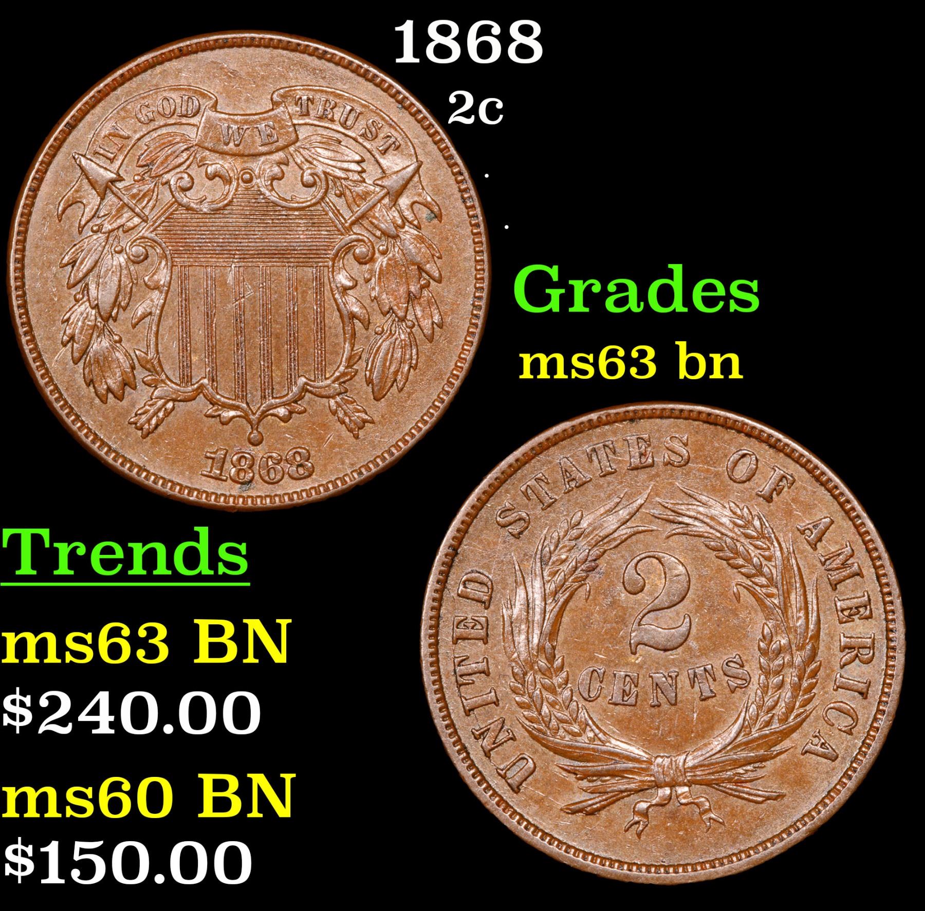 1868 . . Two Cent Piece 2c Grades Select Unc BN.