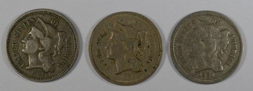 1868 VG, 1869 FINE & 1881 FINE THREE CENT NICKELS