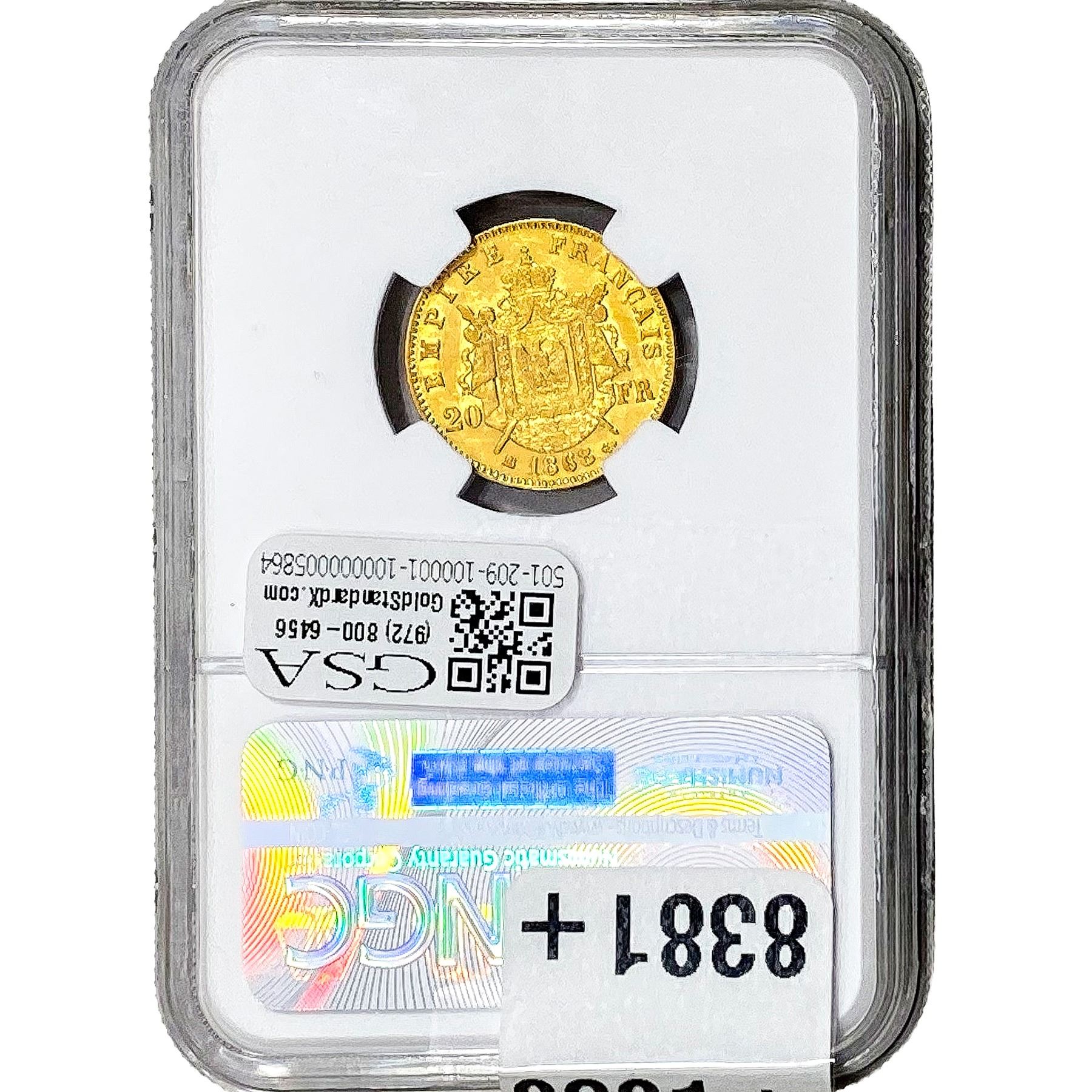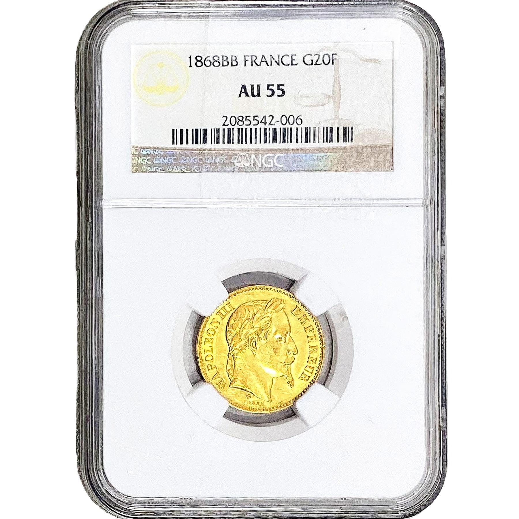 1868BB France .1867 OZ Gold 20 Francs NGC AU55