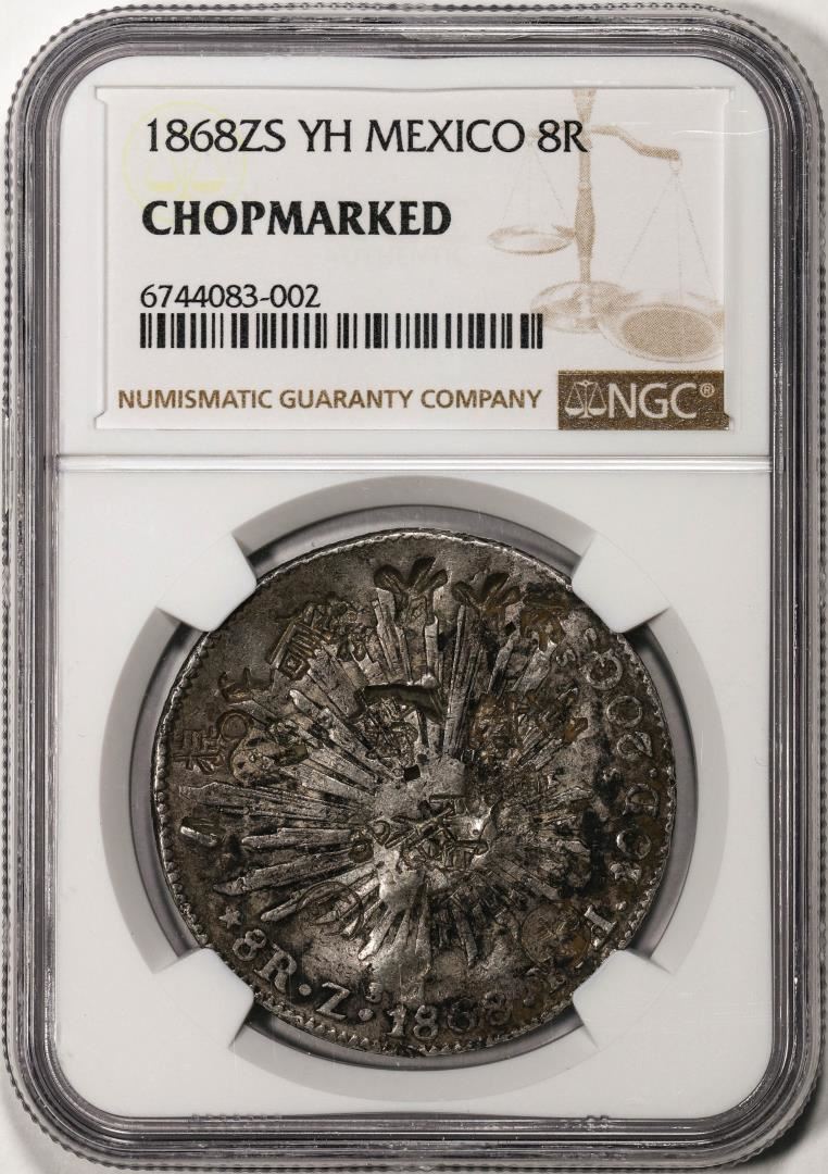 One 1868ZS YH Mexico 8 Reales Silver Coin NGC Chopmarked. NGC Certified.