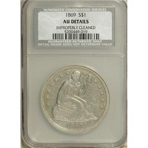 <B>1869 $1 --Improperly Cleaned--NCS. AU Details.</B></I> NGC Census: (0/0). PCGS Population (0/0). Mintage: 423,700. (#6962)<BR><BR><B>Coin Engraver:</B> Christian Gobrecht<BR><BR><b>Shipping:</b> Coins & Currency (<a target="_blank" href="http://www.heritageauctions.com/common/shipping.php">view shipping information</a>)