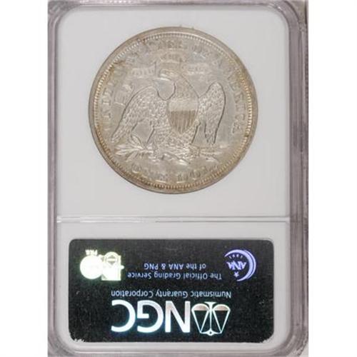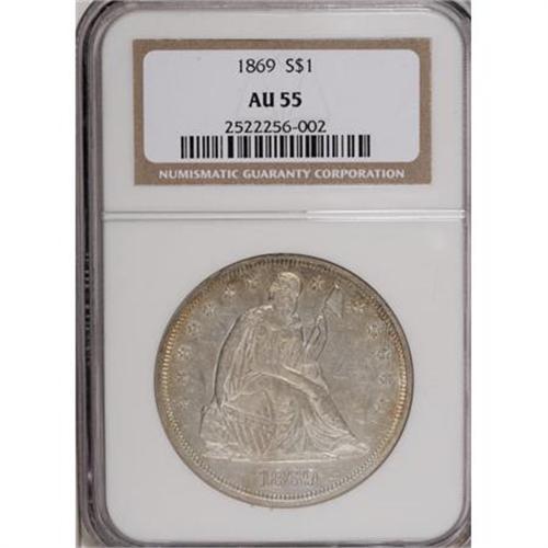 <B>1869 $1 AU55 NGC.</B></I> The 1869 was struck in reasonable quantity, but most pieces were exported, and relatively few survive in XF or better grades. The present example has light gold toning and ample bright luster. Moderate abrasions include straight thin marks near the pole. Census: 10 in 55, 45 finer (2/08).<BR><BR><B>Coin Engraver:</B> Christian Gobrecht<BR><BR><b>Shipping:</b> Coins & Currency (<a target="_blank" href="http://www.heritageauctions.com/common/shipping.php">view shipping information</a>)