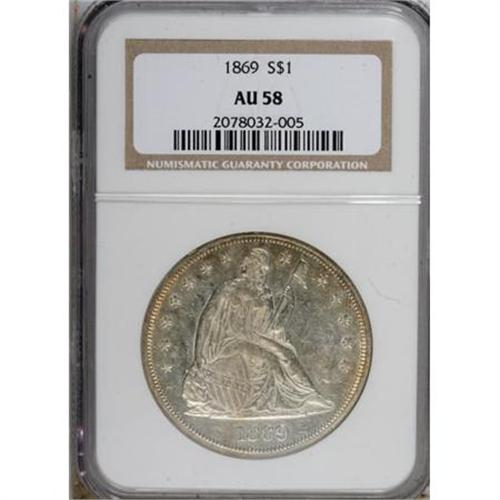 <B>1869 $1 AU58 NGC.</B></I> Despite a generous mintage of 423,700 pieces, the 1869 silver dollar was melted in quantity, and only a fraction of the original production survives today. This luminous near-Mint piece has silver-gray centers with areas of orange toning at the rims. Well struck with a number of abrasions in the fields, though actual friction is minimal. Census: 13 in 58, 31 finer (7/07).<BR><BR><B>Coin Engraver:</B> Christian Gobrecht<BR><BR><b>Shipping:</b> Coins & Currency (<a target="_blank" href="http://www.heritageauctions.com/common/shipping.php">view shipping information</a>)