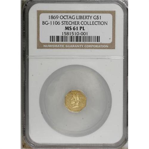 <B>1869 $1 Liberty Octagonal 1 Dollar, BG-1106, High R.4, MS61 Prooflike NGC.</B></I> Ex: Stecher Collection. Die State II. The G is absent beneath the portrait. Evenly struck and nicely mirrored with a couple of small strike-throughs (as made) near the right reverse border. An appealing Mint State example of this octagonal dollar variety.<BR><BR><b>Shipping:</b> Coins & Currency (<a target="_blank" href="http://www.heritageauctions.com/common/shipping.php">view shipping information</a>)