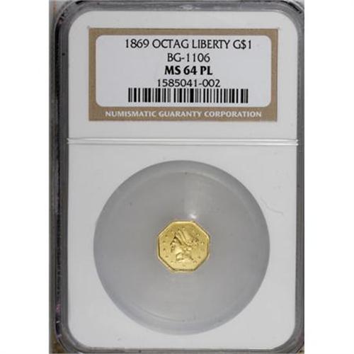 <B>1869 $1 Liberty Octagonal 1 Dollar, BG-1106, High R.4, MS64 Prooflike NGC.</B></I> A prominently mirrored near-Gem with radiant fields and pleasing eye appeal. The LL in DOLLAR is legible, better definition than is usual for this indifferently struck variety. Census: 2 in 64 PL, 1 finer as 65 DPL (7/07).<BR><BR><b>Shipping:</b> Coins & Currency (<a target="_blank" href="http://www.heritageauctions.com/common/shipping.php">view shipping information</a>)