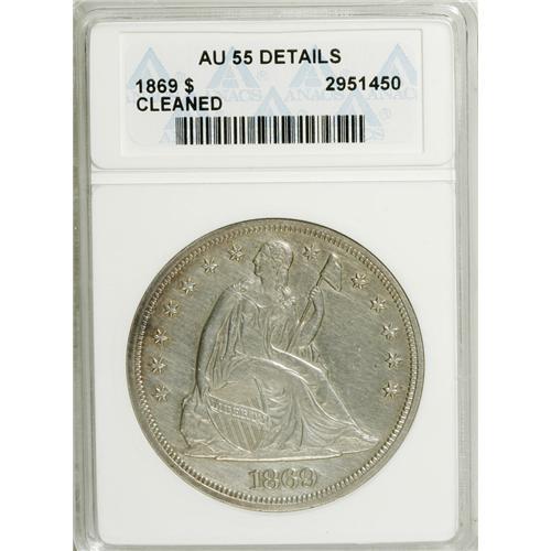 <B>1869 $1 --Cleaned--ANACS. AU55 Details.</B></I> NGC Census: (8/42). PCGS Population (22/56). Mintage: 423,700. Numismedia Wsl. Price: $850. (#6962)<BR><BR><b>Shipping:</b> Coins & Currency (<a target="_blank" href="http://www.heritageauctions.com/common/shipping.php">view shipping information</a>)