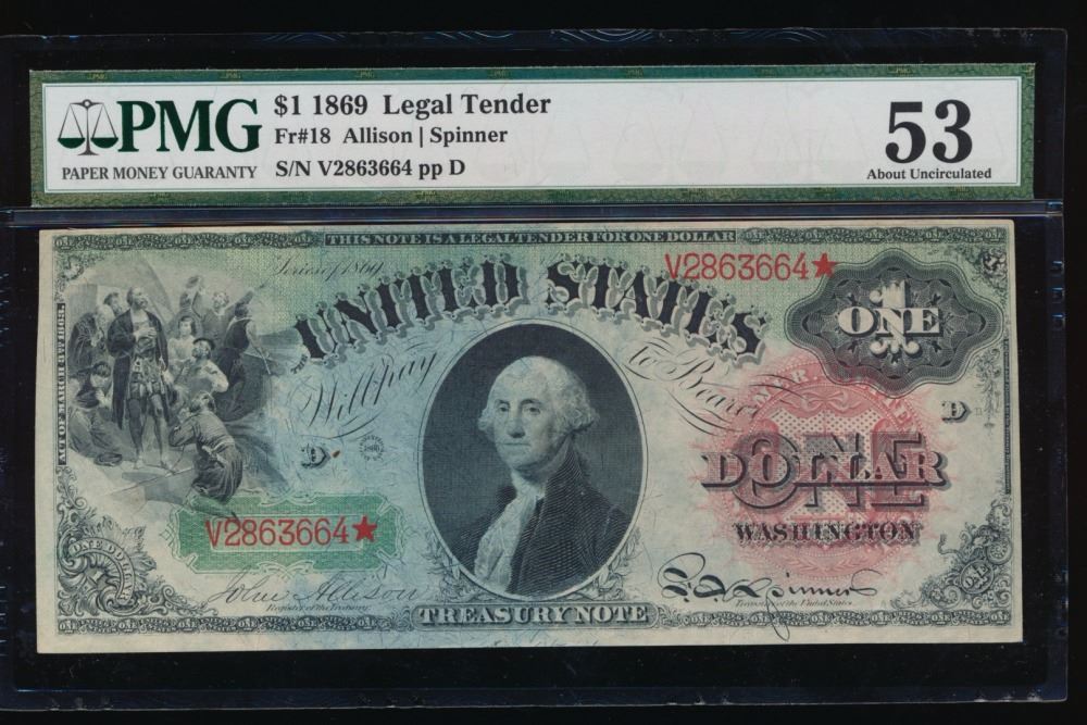 One 1869 $1 Legal Tender Note PMG 53.