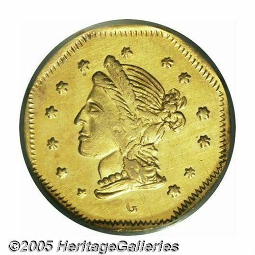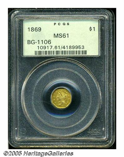 <B>1869<$1> Liberty Octagonal 1 Dollar, BG-1106, High R.4, MS61 PCGS.</B></I> Die State I, with initial G visible below the bust. The Indian head has a prominent chin, and arrow heads bookend the 1 in the denomination. A vertical die crack bisects the reverse, with another spindly crack through the first A in CALIFORNIA. The centers have minor softness of strike, and the fields have wispy slide marks.