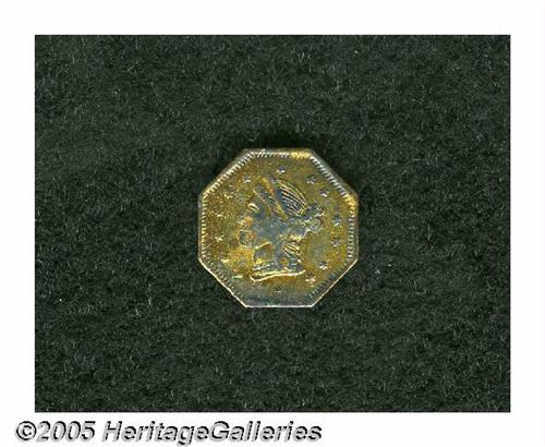 <B>1869<$1> Liberty Octagonal 1 Dollar, BG-1106, High R.4, AU50 Damaged Uncertified.</B></I> Likely subjected to heat in the past, the devices show little evidence of wear, but the fields are pebbled and the portrait has dark charcoal color. Rich orange, ruby, and aqua toning dominates the fields.