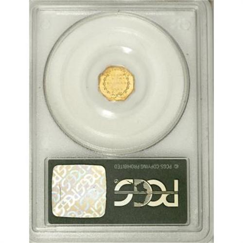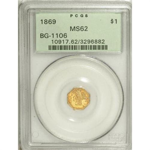 <B>1869 $1 Liberty Octagonal 1 Dollar, BG-1106, High R.4, MS62 PCGS.</B></I> Attractive orange-red shades adorn the borders, while the centers are yellow-gold. A few faint hairlines are present, and the LL in DOLLAR is typically brought up. Certified in a green label holder.<BR><I>From The Vanek Collection.</B></I><BR><BR><b>Shipping:</b> Coins & Currency (<a target="_blank" href="http://www.heritageauctions.com/common/shipping.php">view shipping information</a>)