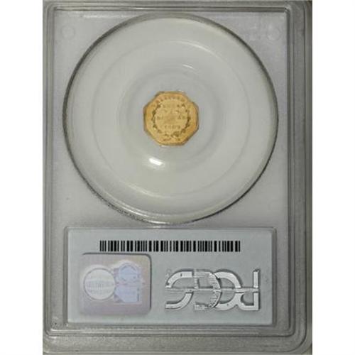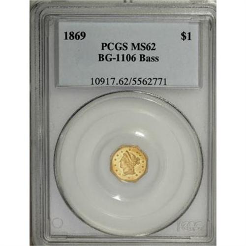<B>1869 $1 Liberty Octagonal 1 Dollar, BG-1106, High R.4, MS62 PCGS.</B></I> Ex: Bass. The reflective yellow-gold fields are accented by peripheral glimpses of peach toning. The central reverse has a hair-thin diagonal mark. Population: 21 in 62, 11 finer (1/08).<BR><I>Ex: Ronald J. Gillio, 1975; Harry W. Bass, Jr. Collection, Part One (Bowers and Merena, 5/99), lot 2762.</B></I><BR><BR><b>Shipping:</b> Coins & Currency (<a target="_blank" href="http://www.heritageauctions.com/common/shipping.php">view shipping information</a>)