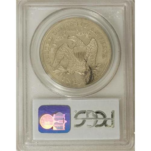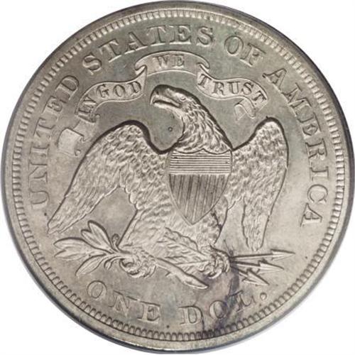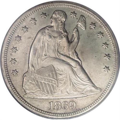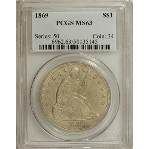 <B>1869 $1 MS63 PCGS.</B></I> This date is seldom encountered in Mint State, and business strikes are far rarer than the recorded proof mintage of 600 pieces. Between NGC and PCGS combined, they have certified only 229 business strikes in all grades, despite the recorded mintage of nearly 424,000 pieces. This example shows a bold strike on both sides, with gray-gold surfaces that show a bit of field haze, somewhat diminishing the luster. A small bit of struck-in grease, as made, is noted on the lower reverse. Nonetheless an attractive and rare coin. Population: 13 in 63, 10 finer (7/07).<BR><BR><B>Coin Engraver:</B> Christian Gobrecht<BR><BR><b>Shipping:</b> Coins & Currency (<a target="_blank" href="http://www.heritageauctions.com/common/shipping.php">view shipping information</a>\)
