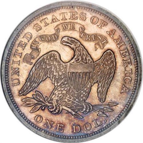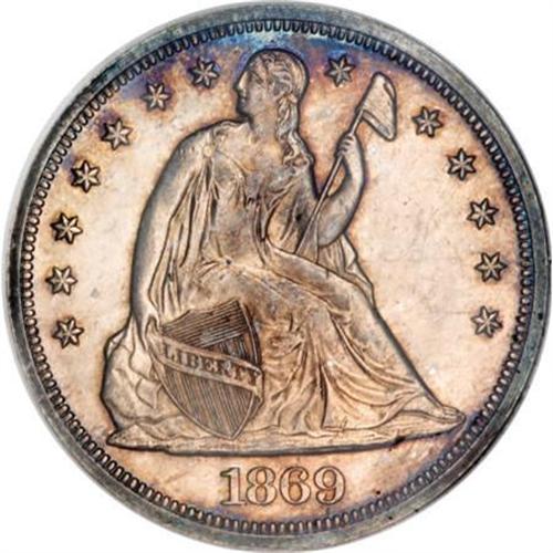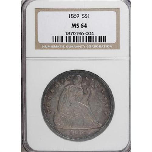 <B>1869 $1 MS64 NGC.</B></I> At 423,700 business strikes, the 1869 Liberty Seated dollar is on the high side among series mintages. Whatever happened to most of those coins is quite a mystery. Q. David Bowers notes in his <I>Silver Dollars and Trade Dollars of the United States: A Complete Encyclopedia: </B></I>"In <I>The Gobrecht Journal, </B></I>March 1986, Harry E. Salyards, M.D. contributed 'Rarity of the 1869 Dollar,' which told of his survey of 57 different coins which appeared in 128 auction sales, 1975-1985. He noted that ... 36 Proofs [of just 600 made] appeared in comparison to only 23 business strikes. The latter broke down to eight Uncirculated coins and 14 in lesser grades."<BR> Today the situation is not dissimilar: The NGC-certified population of 1869 business strikes comprises 83 coins, only 32 of which are Mint State. There are only nine MS64 pieces at NGC, with three Gems finer. On the proof side, there are 196 proofs, with PR64 about the median grade (3/08). <BR> This piece has lovely, even reddish-golden toning over each side with an occasional accent of deep blue at the margins. The strike is full throughout, with no obvious or distracting marks on either side.<BR><I>Ex: Stack's private treaty, flip included.</B></I><BR><I>From The Queller Family Collection of Silver Dollars.</B></I><BR><BR><B>Coin Engraver:</B> Christian Gobrecht<BR><BR><b>Shipping:</b> Coins & Currency (<a target="_blank" href="http://www.heritageauctions.com/common/shipping.php">view shipping information</a>)