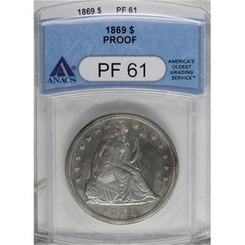 <B>1869 $1 PR61 ANACS.</B></I> Occasional splashes of faint gray or light tan color visit this sharply struck proof dollar. The surfaces are abrasion free, but show subdued reflectivity.<B><BR></B></I><I>From The Beau Clerc Collection.</B></I><BR><BR><B>Coin Engraver:</B> Christian Gobrecht<BR><BR><b>Shipping:</b> Coins & Currency (<a target="_blank" href="http://www.heritageauctions.com/common/shipping.php">view shipping information</a>)