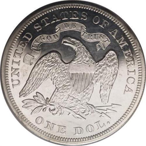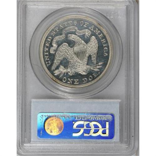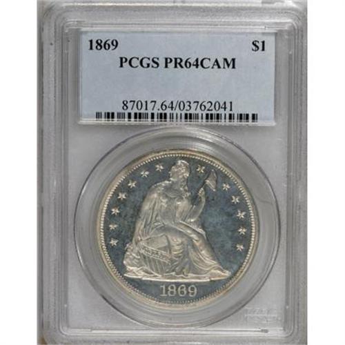 <B>1869 $1 PR64 Cameo PCGS.</B></I> An amazing Cameo proof, this Choice quality piece has few peers certified by PCGS. Both sides are brilliant with glittering silver surfaces splashed by traces of gold and darker speckles. The surfaces are nicely preserved with only a few blemishes that are consistent with the grade. Population: 10 in 64 Cameo, 4 finer (8/07).<BR><BR><b>Shipping:</b> Coins & Currency (<a target="_blank" href="http://www.heritageauctions.com/common/shipping.php">view shipping information</a>)