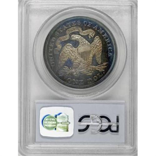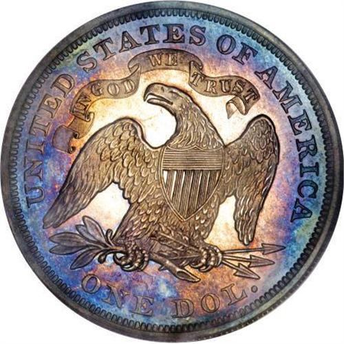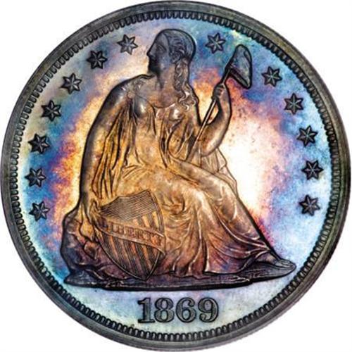 <B>1869 $1 PR64 Cameo PCGS.</B></I> More than half of the 600-piece mintage of 1869 proof dollars have been certified by PCGS and NGC, making this issue fairly available to collectors. Far fewer cameoed examples have been graded (roughly 50 pieces). This near-Gem Cameo specimen displays deep aqua-blue, purple, and golden-tan peripheral toning framing champagne-gold centers. Wonderfully preserved surfaces exhibit boldly struck design features. This is a truly nice coin, that appears to be conservatively graded. Population: 10 in 64 Cameo, 4 finer (11/07).<BR><BR><b>Shipping:</b> Coins & Currency (<a target="_blank" href="http://www.heritageauctions.com/common/shipping.php">view shipping information</a>)
