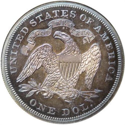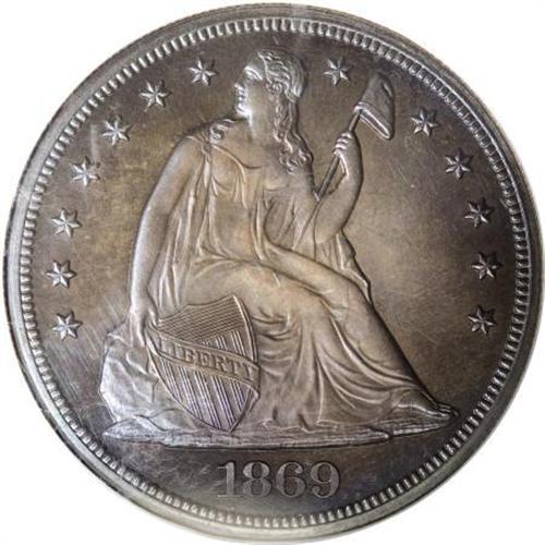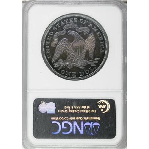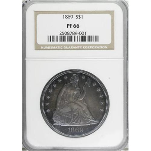 <B>1869 $1 PR66 NGC.</B></I> This deeply toned Premium Gem proof has lovely lilac and steel-blue toning on both sides, more vivid on the reverse. The surfaces of this beauty are spectacular, without hairlines or other blemishes of any note.<BR> While the original 600 coin proof mintage for this date certainly seems sufficient to supply collector demand today, with more than half that number certified, this issue remains a rarity in Gem or finer quality. For example, Heritage has sold exactly one piece better than PR65 during the past four years. Census: 11 in 66, 6 finer (6/07).<BR><BR><b>Shipping:</b> Coins & Currency (<a target="_blank" href="http://www.heritageauctions.com/common/shipping.php">view shipping information</a>)