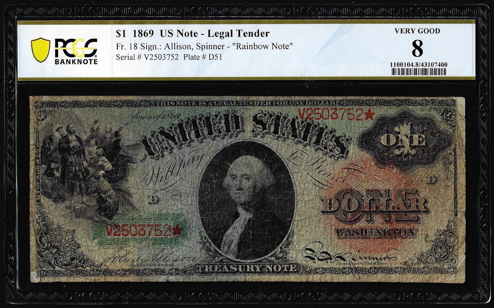 One 1869 $1 Rainbow Legal Tender Note Fr.18 PCGS Very Good 8. PCGS Graded.