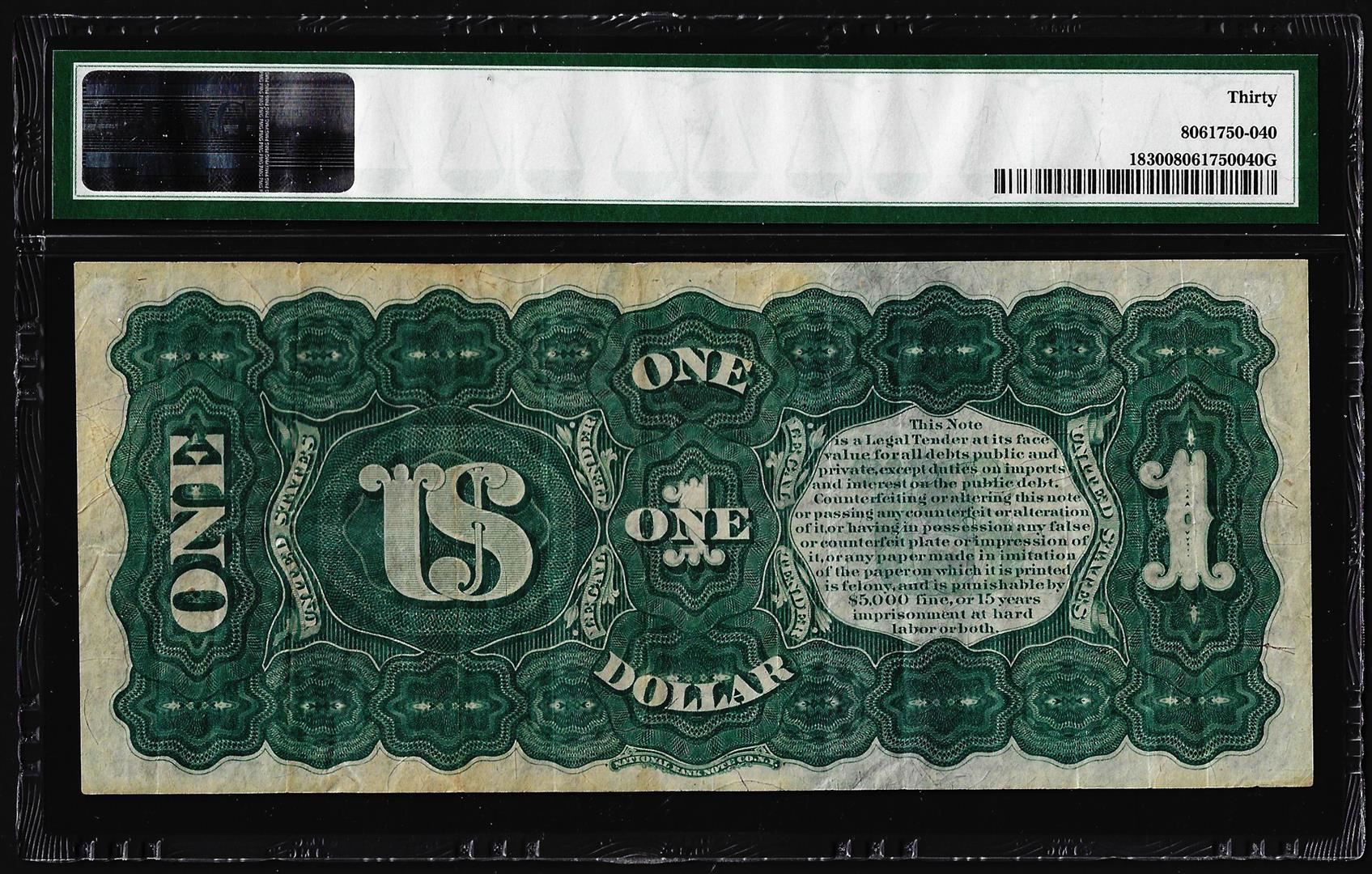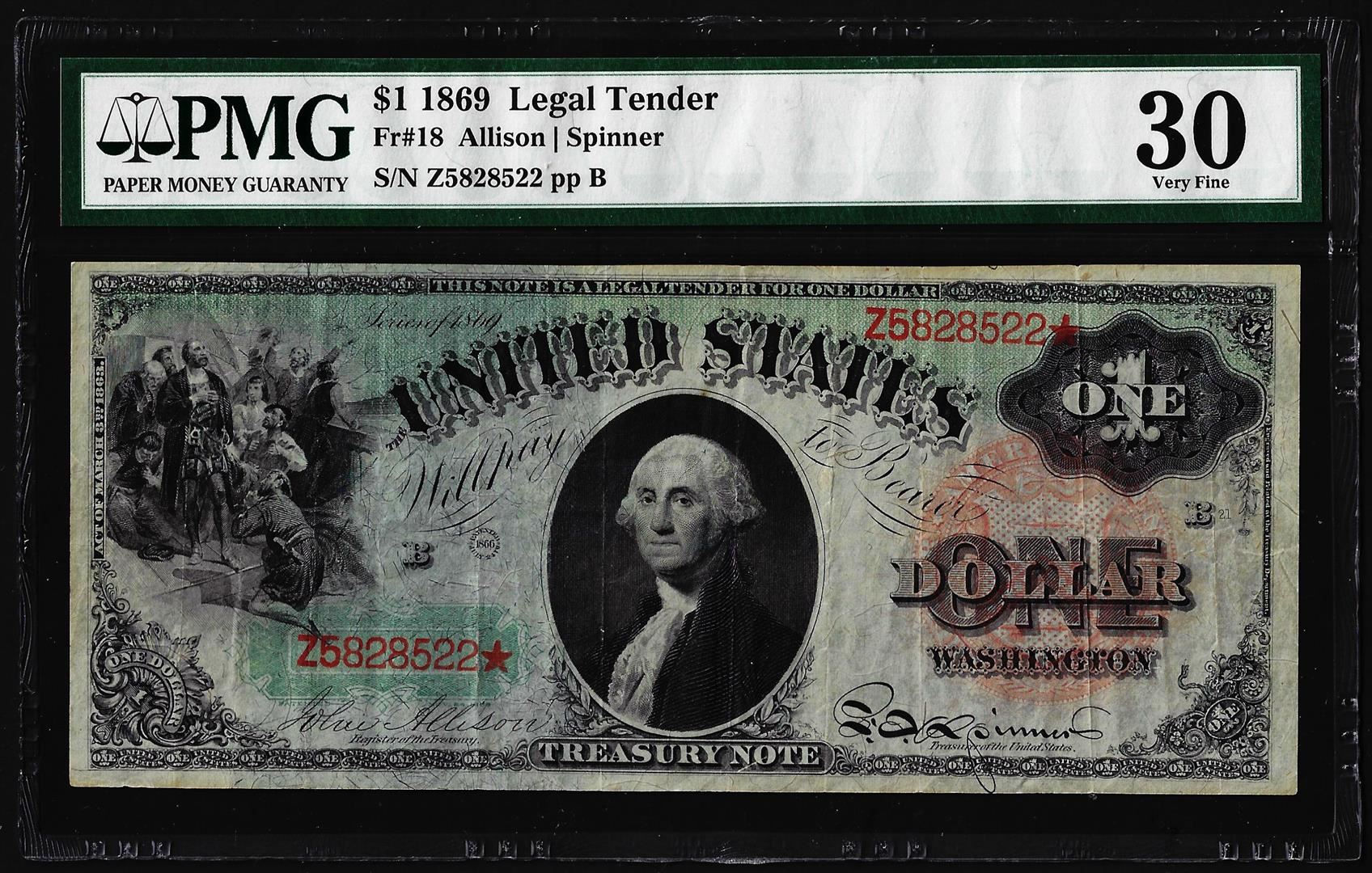 One 1869 $1 Rainbow Legal Tender Note Fr.18 PMG Very Fine 30. PMG Certified.