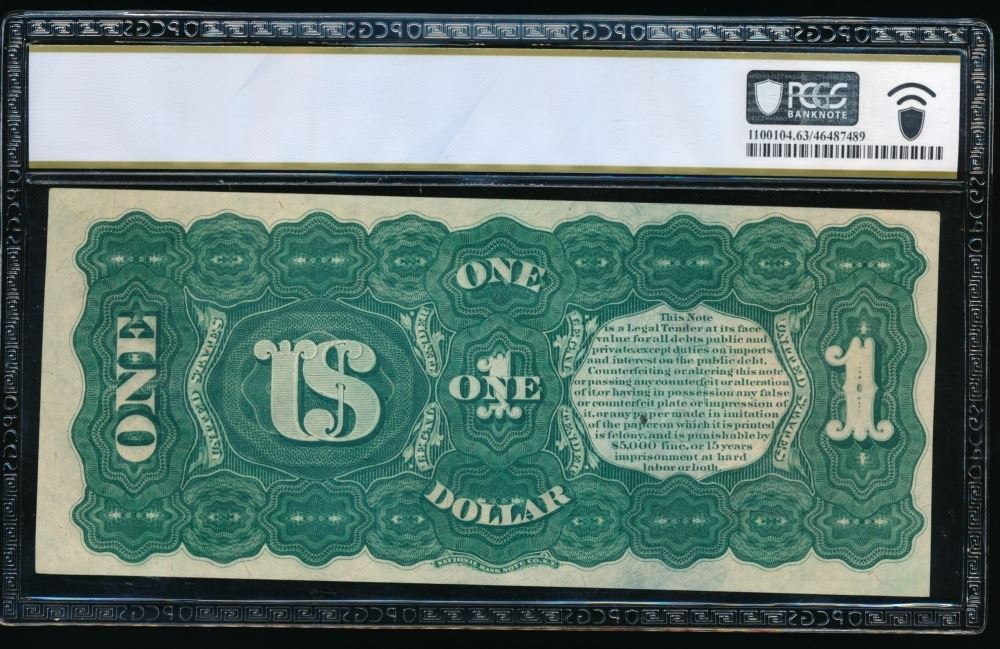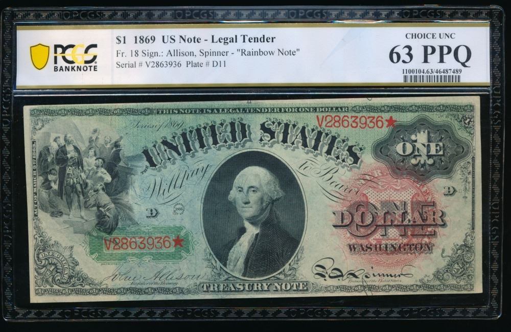 One 1869 $1 Rainbow Legal Tender Note PCGS 63PPQ.