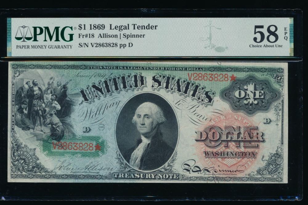 One 1869 $1 Rainbow Legal Tender Note PMG 58EPQ.