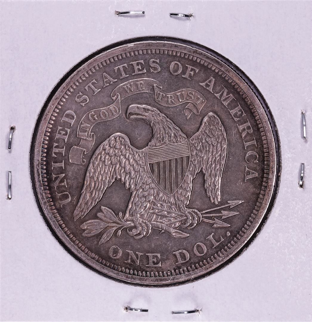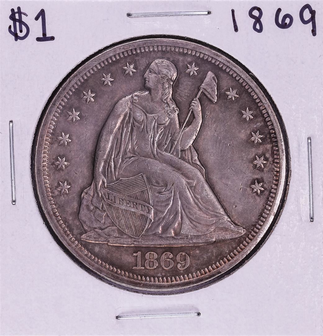One 1869 $1 Seated Liberty Silver Dollar Coin.