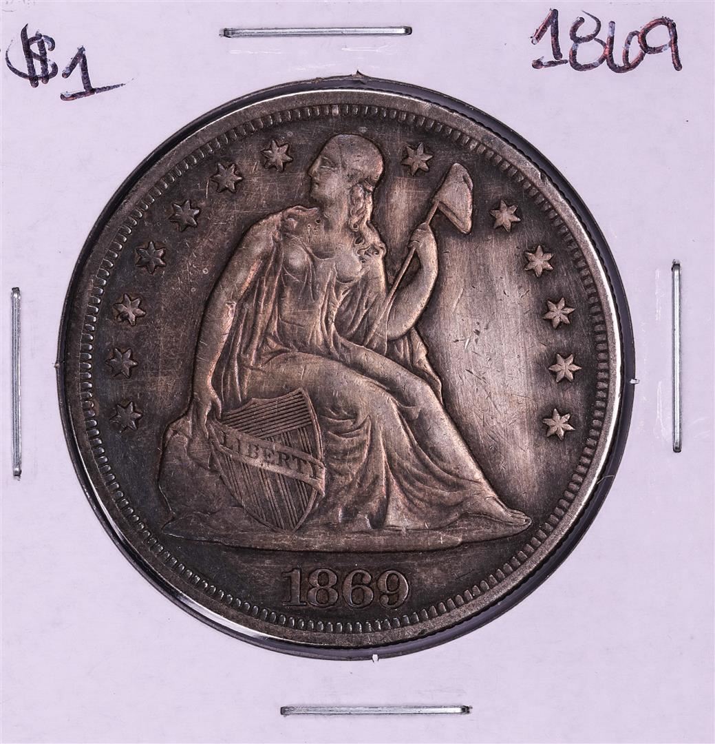 One 1869 $1 Seated Liberty Silver Dollar Coin.