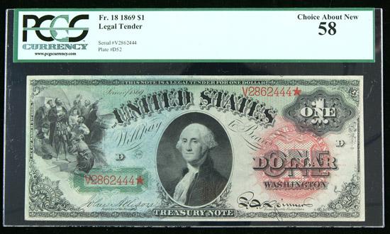 1869, $1 United States Note. PCGS Choice About New 58. . Fr-18. A couple of trivial corner folds appear to be all that separate this lovely Rainbow Ace from a much higher grade. The colors and inks are outstanding, and the eye appeal is tremendous. Without the aforementioned light folds, the margins would fully support a Gem grade.