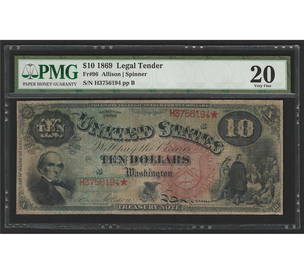 One 1869 $10 Legal Tender Large Red Seal Rainbow Note PMG Graded VF20. There is a very small pin hole in the center of the note not mentioned by PMG. PMG Certified.