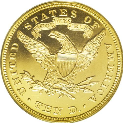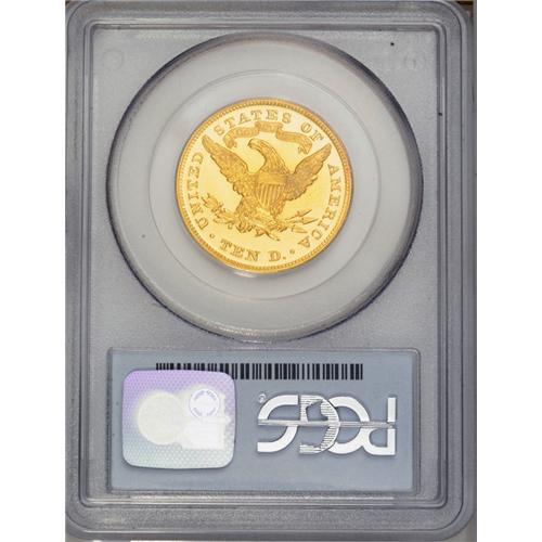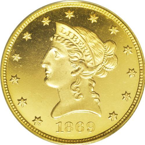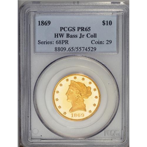<B>1869<$10> PR65 PCGS.</B></I> Harry Bass Collection. The 1869 proof ten is extremely rare and seldom offered except in the sale of a major gold collection. Comparing the notes for diagnostics of proofs from Breen and Harry Bass, we come away scratching our heads wondering, what was Walter looking at? Harry Bass' notes about the diagnostic features are certainly accurate for this coin, and unless there was a second die used to strike the 25 proofs of this issue, Breen was confused. As noted in the Bass catalog, "Date logotype lightly into die, somewhat to the left, and ever so slightly high (with regard to the first digit). On the head of Miss Liberty some markers serve to identify the die, including a rust spot resembling a tiny earring beneath the lobe, and several scattered rust spots to the left of the lowest left curl."<BR> Of the 25 proofs struck, probably no more than 7-9 individual pieces are known today in all grades. This is certainly one of the finest. Only one other Gem has been certified, one PR66, and two PR66 Deep Cameo proofs. At this point we should pause and point out the thick mint frost on the devices of this piece and the resultant strong cameo contrast between the fields and devices. We certainly perceive this coin to be a Cameo, and perhaps even a Deep Cameo. The only 1869 sold in recent years was one of the Deep Cameo pieces in our November 2003 Auction. That coin brought $58,075, a figure this piece will likely eclipse.<BR> The surfaces are free from any noticeable or mentionable contact marks. Magnification reveals very few defects as well, just a few tiny lint marks scattered over the obverse which are typically found on proof gold of this era. Medium reddish-gold coloration is seen over each side of this impressive early piece of proof gold.<BR><I>Ex: Gaston DiBello Collection (Stack's, 5/70), lot 1078; Harry Bass II (Bowers and Merena, 10/99),