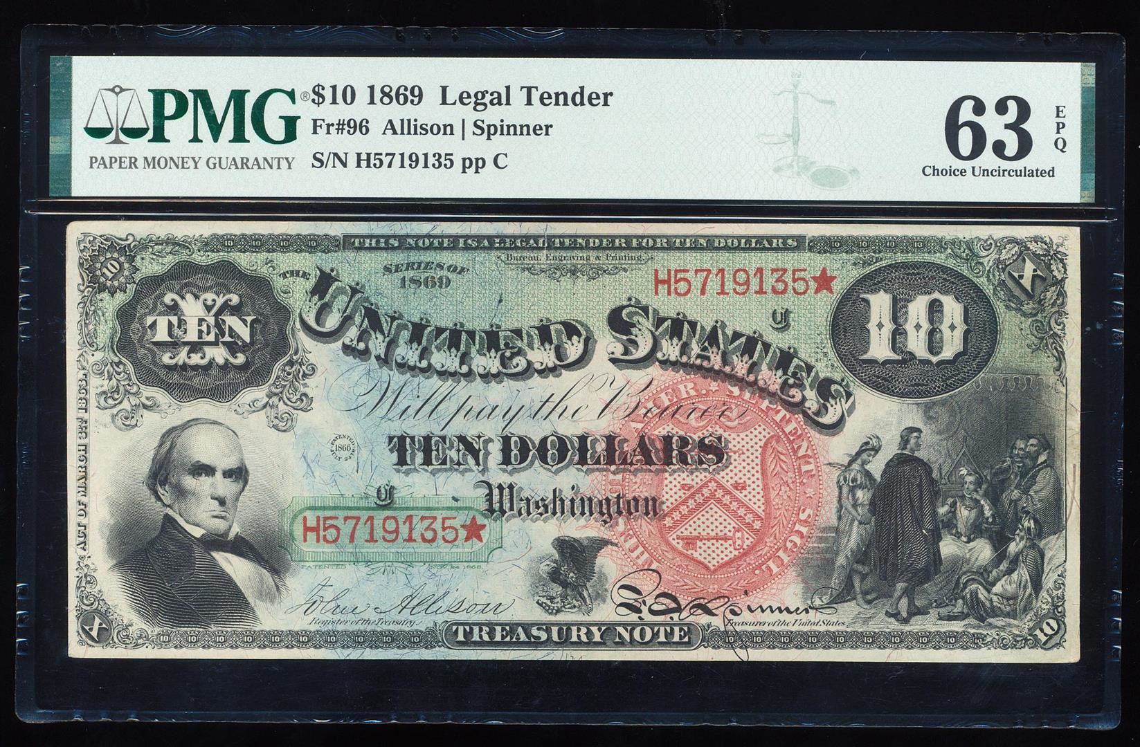 One 1869 $10 Rainbow Jackass Legal Tender Note Fr.96 PMG Choice Uncirculated 63EPQ. PMG Certified.