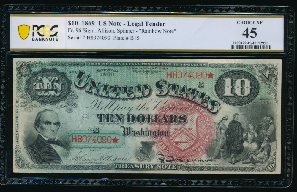 One 1869 $10 Rainbow Legal Tender Note PCGS 45.