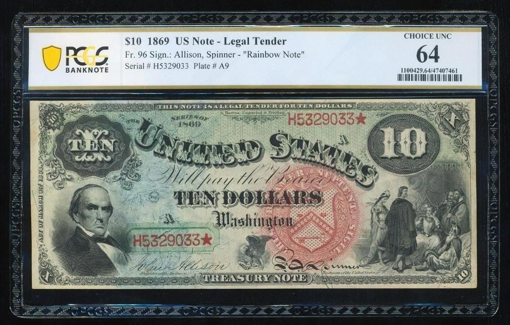 One 1869 $10 Rainbow Legal Tender Note PCGS 64.