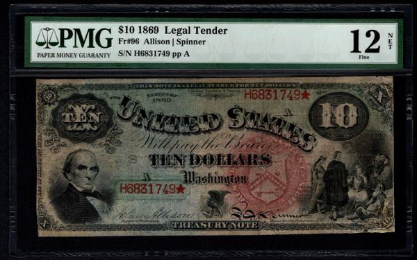One 1869 $10 Rainbow Legal Tender Note PMG 12NET.