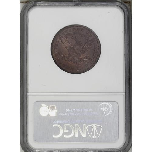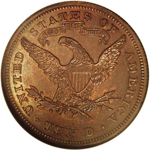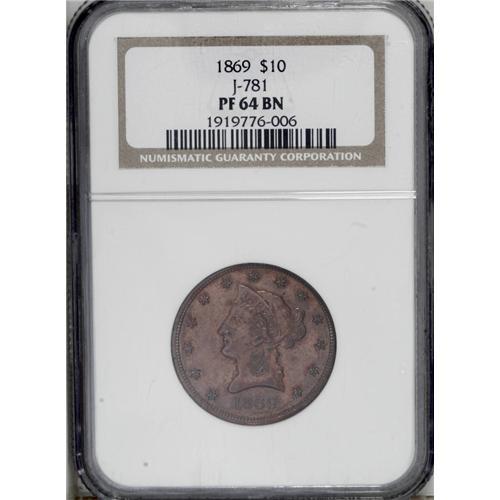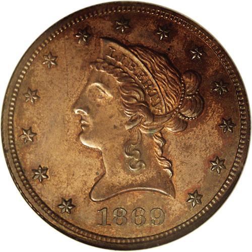 <B>1869<$10> Ten Dollar, Judd-781, Pollock-866, High R.7, PR64 Brown NGC.</B></I> This die trial issue is of the ten dollar gold piece, but it is struck in copper with a reeded edge. Although such issues are called "die trials," this was a time of Mint shenanigans of various kinds, and many such pieces were made for sale to advanced collectors or to augment the cabinets of highly placed Mint officials. Swirling rose-brown and sky-blue colors enrich this magnificently struck near-Gem. No hairlines or contact is evident; a small spot below star 8 is of little concern. The Judd reference estimates that only three specimens of this rare die trial are known.