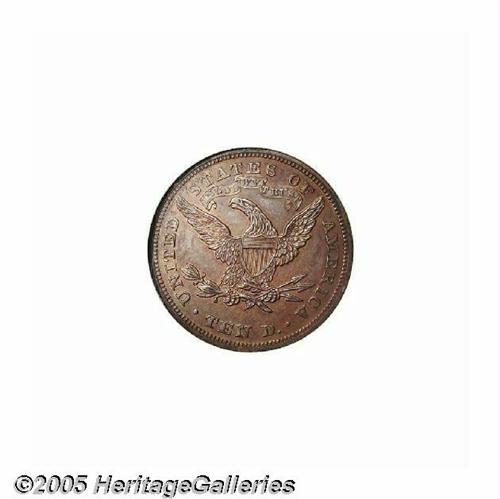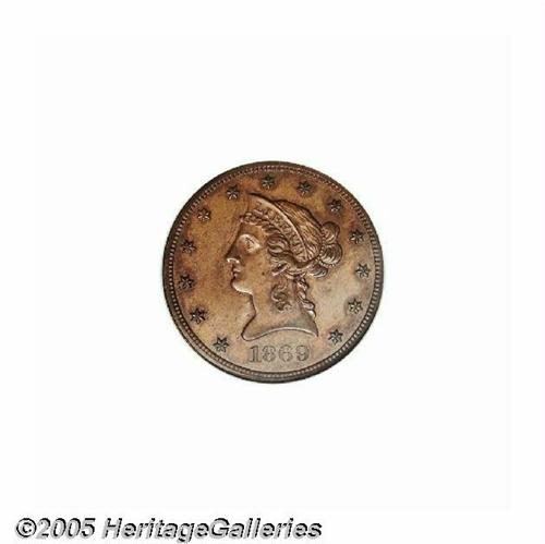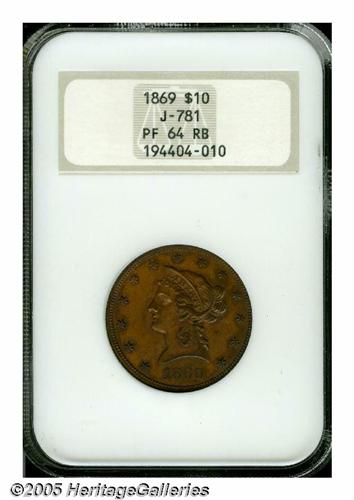 <B>1869<$10> Ten Dollar, Judd-781, Pollock-866, R.7, PR64 Red and Brown NGC.</B></I> Struck with a reeded edge on regular issue dies, but on a copper planchet. Such pieces are referred to as dies trial pieces, however, in many cases they were made to be sold to advanced collectors of the day, or to augment the cabinets of highly placed mint officials. Swirling rose-brown and olive-gold colors enrich this magnificently struck near-Gem. No hairlines or contact is evident, a small spot above Liberty's jaw is of little concern.
