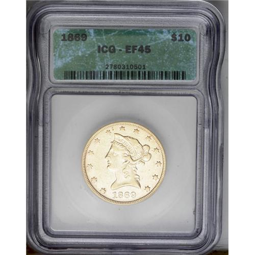 <B>1869<$10> XF45 ICG.</B></I> The 1869 Eagle has a mintage of just 1,830 business strikes and 25 proofs. Unlike certain low mintage gold dollars and three dollar pieces, the 1869 eagle was not saved. Between NGC and PCGS, only three pieces have been certified as Mint State. The present circulated example displays traces of semi-prooflike luster, and although the bright surfaces show many tiny marks, none offend the eye.