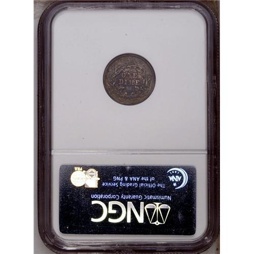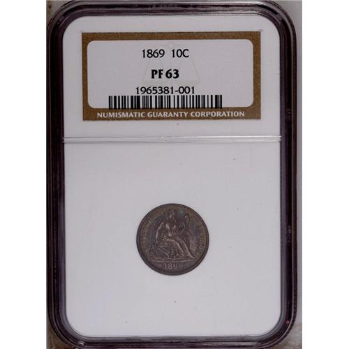 <B>1869<10C> PR63 NGC.</B></I> Fully struck except for portions of the wreath, with a rich coating of champagne-gray toning over both sides and glimmers of multicolored iridescence in the reflective fields. Nicely preserved and free of contact marks or hairlines. A scarce proof issue, as just 600 pieces were minted.